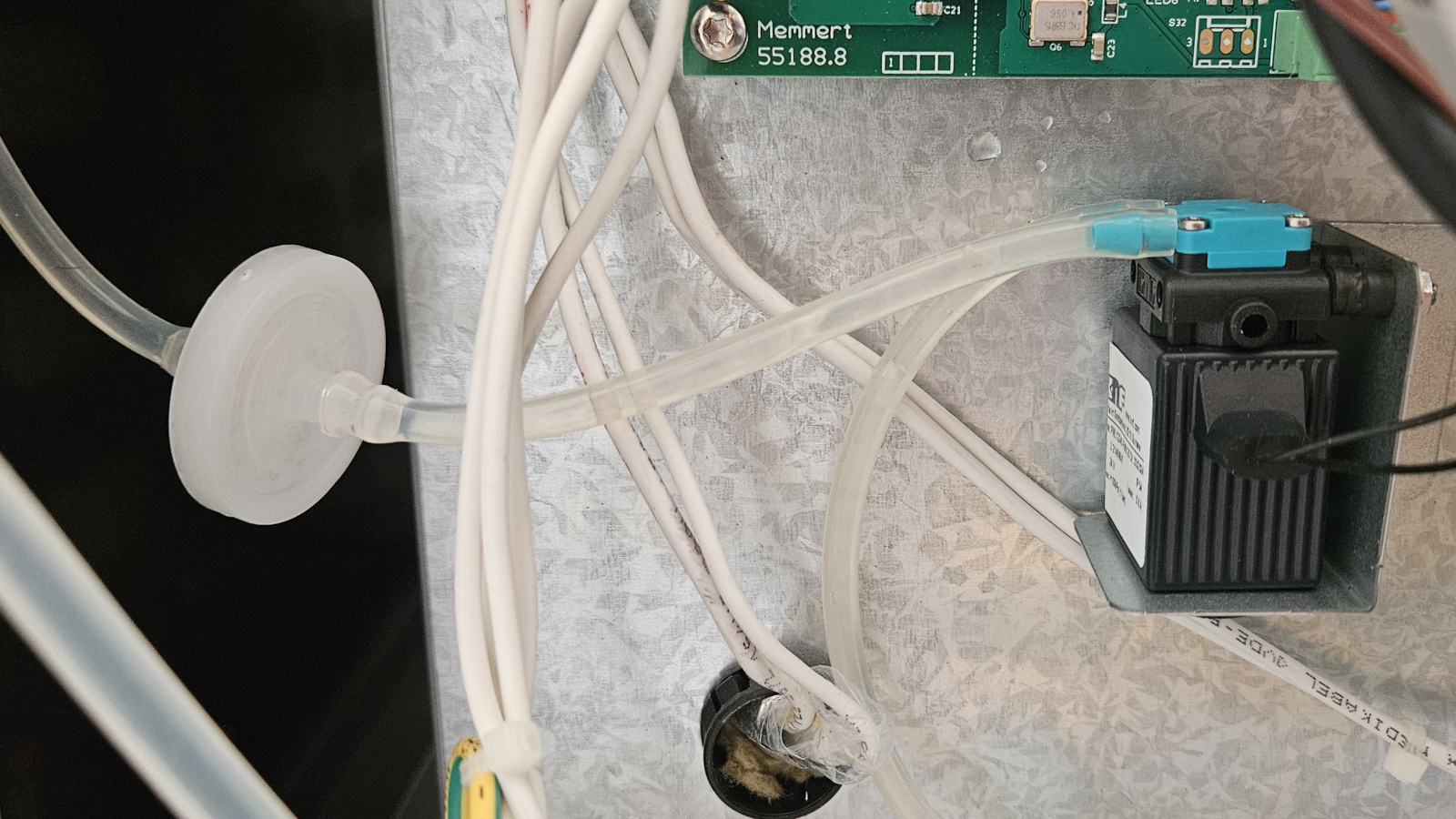Internals of the chamber after opening the back panel.Inlet filter on the left and diaphragm pump on the right. The tube curving downward from the pump leads to the heating element of the humidifier.